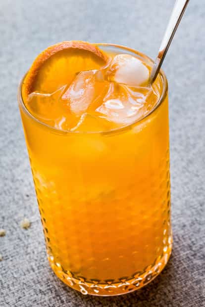 - We recommend serving this drink in a highball glass filled with ice cubes. But hey, if you have a Tiki mug handy, use that. A Collins glass is another great choice.